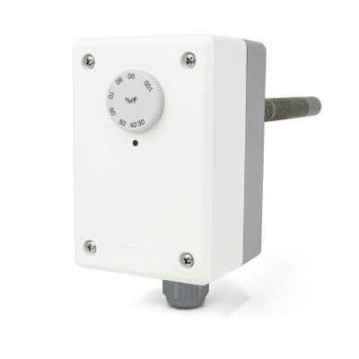 Humidistat, Duct Mount, 0..100% RH, ± 3.0..3.5% RH Accuracy, External Setpoint Dial, SPDT, NEMA 13, 8.594" Probe